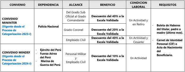 El beneficio ESCALA CONVENIO se aplica conforme a los Convenios Interinstitucionales: