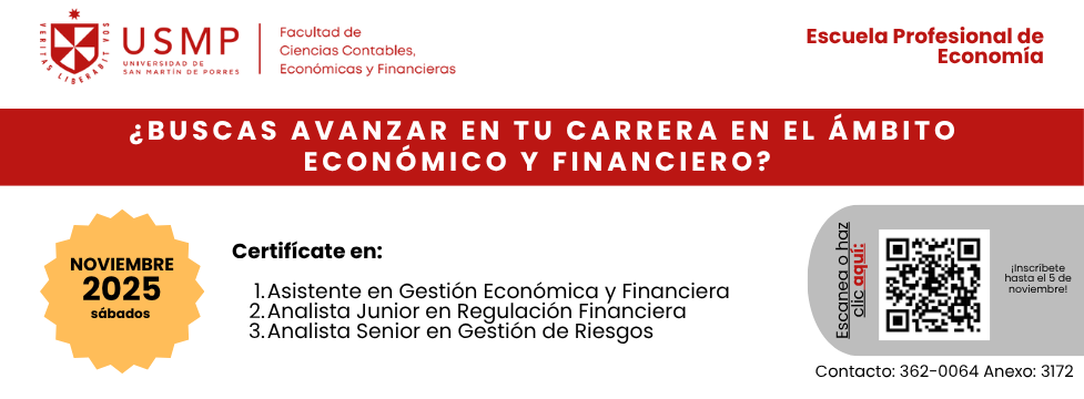 La Escuela Profesional de Economía de la Facultad de Ciencias Contables, Económicas y Financieras presenta su Certificación Progresiva, un programa innovador que complementa tu formación académica y te prepara de manera integral para enfrentar los retos del mercado laboral, tanto a nivel nacional como internacional, en el campo económico y financiero.